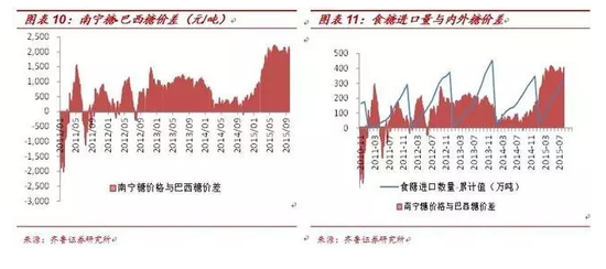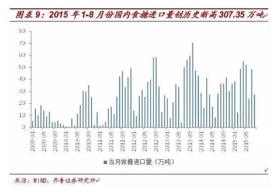 根据中国加入世贸组织的谈判结果,中国对粮、油、糖等大宗农产品进口实行关税配额管理。目前我国的食糖年进口配额是194.5万吨,为了进一步减少外糖对内糖的冲击,从2014年11月开始配额外进口量额度也集中管理。根据各方意见,配额外进口量有望限定为190万吨,据此我们估计2015/16榨季食糖进口量预计会下滑至384.5万吨,同比减少17%左右。