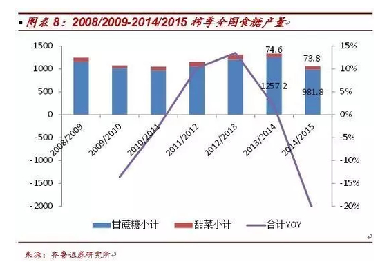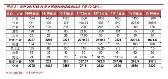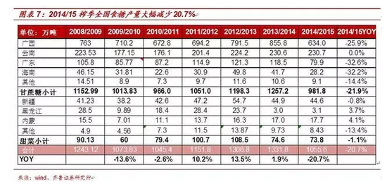 从国家统计局的数据看,规模以上糖企自2013年初已开始进入整体亏损,但周期效应使得糖业直到2014/2015榨季才开启减产之路。2014/15榨季全国糖料种植面积同比下降8.43%,2015/16榨季预计继续同减12.93%。2014/15榨季,我们对分省的糖料种植面积进行了统计,其中广西的甘蔗种植面积减少9.38%至1450万亩,广东甘蔗种植面积减少20%至200万亩,海南甘蔗种植面积减少25.74%至75万亩,云南甘蔗种植面积基本维持。连续三个榨季糖价的下跌,导致甘蔗收购价格下调,而人工成本、地租、生产资料价格还在不断上涨,种植甘蔗的比较收益明显不足,部分蔗农将本应翻种的蔗地改种桑树、木薯、玉米和桉树等。预计14/15榨季甘蔗种植面积减少230万亩,甜菜种植面积减少6.2万亩,整体糖料种植面积同比下滑8.43%。随着2014/15榨季进入尾声,新榨季将在10月份拉开帷幕,根据各地糖协的统计,新榨季种植面积下滑幅度更大,甘蔗种植面积减少320万亩左右,算上甜菜后,糖料种植面积同比下降12.93%。2014年受春旱及台风侵袭,主产区广西在14/15榨季单产有所下降。影响甘蔗单产的主要因素是蔗种、田间护理程度和天气。广西地区主要种植品种仍为新台糖22号,新蔗种改良进度缓慢,短期亩产难以提升;随着蔗农收入持续下降,化肥等投入也在减少,田间护理明显减少;从天气角度看,广西南部地区春季干旱导致出苗率偏低, “威马逊”台风导致该地区甘蔗大面积倒伏,崇左、南宁等地平均亩产减少0.3-0.4吨/亩至4.2吨左右。2014/15榨季全国食糖产量大幅减少20.7%至1055.6万吨,预估15/16榨季继续减产150万吨。分省来看,广西糖减产221.8万吨至634万吨,减产比例高达25.9%,广东减产38.7万吨至79.9万吨,海南减产13.4万吨至28.2万吨,总的来看,全国2014/15榨季食糖产量减产20.7%至1055.6万吨。由于糖料种植面积的持续减少,根据9月份召开的中糖协营口加工糖会议预测,2015/16榨季国内将减产150万吨至906万吨。