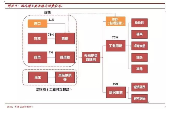 从糖的产业链来看,供应端主要有三大来源,一是以蔗糖、甜菜糖为主的食糖,二是自加入世贸组织后供给占比迅速扩大的食糖进口,三是以果葡糖浆等工业用糖为主的淀粉糖;消费端主要有工业用糖和居民用糖两个去向。工业库存与国家储备作为平抑糖价周期波动的蓄水池,在产业链和价格影响中起着举足轻重的作用。