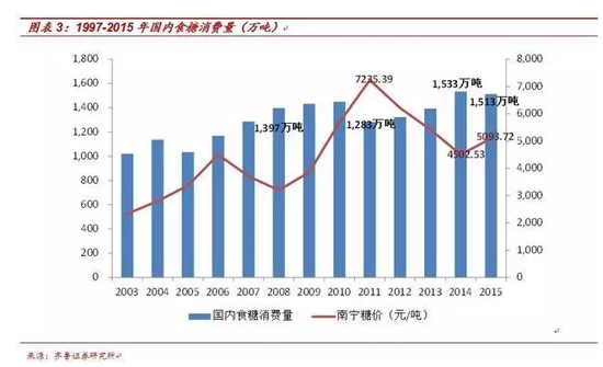 2001-2015年:消费量较快增长且略有波动,由915万吨增长到2008/2009榨季的1390万吨,近5个榨季因高糖价制约以及淀粉糖、果浆糖等替代品的发展,食糖消费量经过回调后恢复增长,目前消费量基本稳定在1400-1550万吨。