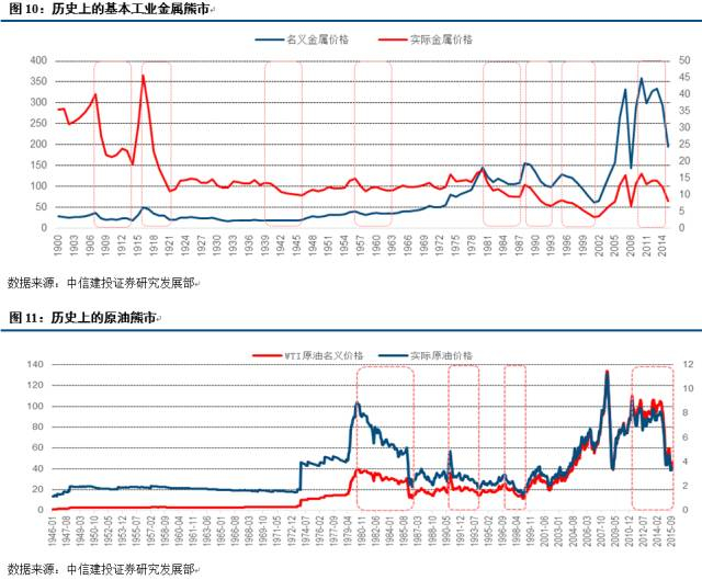 我们统计了自1900年以来的金属熊市,前7次熊市平均下跌时间为6年,而本次熊市自2011年以来已经下跌5年。实际价格平均跌幅为44.4%,而本次熊市跌幅为54.9%。名义价格平均跌幅为34.8%,而本次熊市跌幅为50.8%。就金属熊市来看,本次跌幅已经超过平均水平。我们统计了1980年后的三次原油熊市,平均下跌时间为5年,而本次熊市自2011年以来已经下跌5年。实际价格平均跌幅为54.6%,而本次熊市跌幅为63.1%。名义价格平均跌幅为57.4%,而本次熊市跌幅为61.1%。就原油熊市来看,本次跌幅已经超过平均水平。
