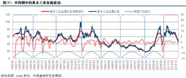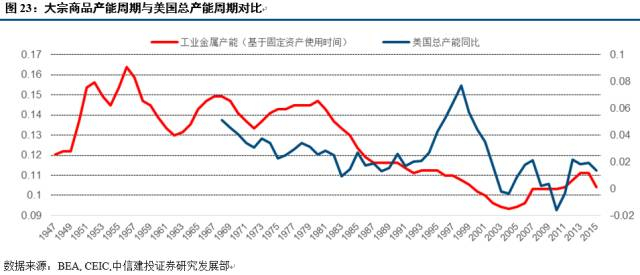 但有一点值得注意,就是根据我们以前《中国经济即将触底》的研究,美国的产能周期的平均下行期为5年,而中国的产能周期下行期也是5年,从上述大宗商品产能周期的研究可以看出,大宗商品产能周期的重要下行波动也是5-7年,这一点也是具有一定的可比较意义的。