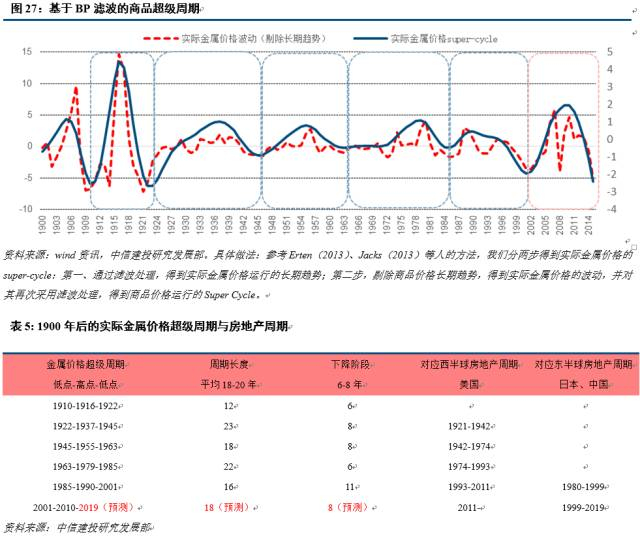 从结果来看,以金属价格为代表的商品的超级周期,即商品价格与长期趋势的偏离走势,大致存在一个平均18-20年的周期性波动,这种波动显然是由一些经济中比产能周期更短的因素所导致的,目前来看,我们推测这与固定资产投资所导致的需求增加有关。实际上,虽然固定资产投资增加的可见因素是朱格拉中周期,但固定资产投资中长期趋势对于国别来讲还是房地产周期。我们也将商品超级周期与房地产周期进行了比对,因为东西半球的房地产周期启动点差10年,所以,比对的结果是,商品的超级周期在1960年之前更多跟随西半球的房地产周期波动,而在1960年之后,则更加倾向于东半球的房地产周期。