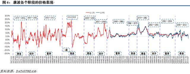 如果我们以美国的CPI来看,美国的CPI和PPI长期来看是一致的,所以我们以康波划分美国的CPI趋势,得到的结论是很有意义的。从图6的结论来看,1、康波的繁荣期100%概率是价格的平稳期;2、康波的回升期三次中有两次价格平稳;3、康波的衰退期价格100%剧烈波动;4、康波的萧条期100%都是冲高回落。这个研究的意义在于,我们正处在衰退即将结束,向第五波康波萧条过渡的阶段,而当前全球都处于货币大量释放后的通缩阶段,康波的规律向我们预示了,目前处于价格低点附近的概率非常高,这为我们的价格低点研究提供了佐证。