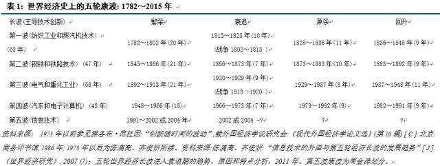 康德拉季耶夫周期理论是世界商品价格的根本决定力量,这一点我们在《康波中的价格波动》中已经详细论述。目前受到比较广泛认可的康波划分方法是荷兰经济学家雅各布·范杜因的划分。在他的划分中列出了有资本主义世界以来前四次康波的四阶段划分,以及标志性的技术创新。从表1中可以看出,第五次康波自1982年起进入回升阶段,1991年之后进入繁荣,而根据我们对康波的理解,我们定位主导国美国繁荣的高点为康波繁荣的顶点,即2000年或2004年。2004年之后,康波进入衰退阶段,而第五波康波的标志性技术创新为信息技术。