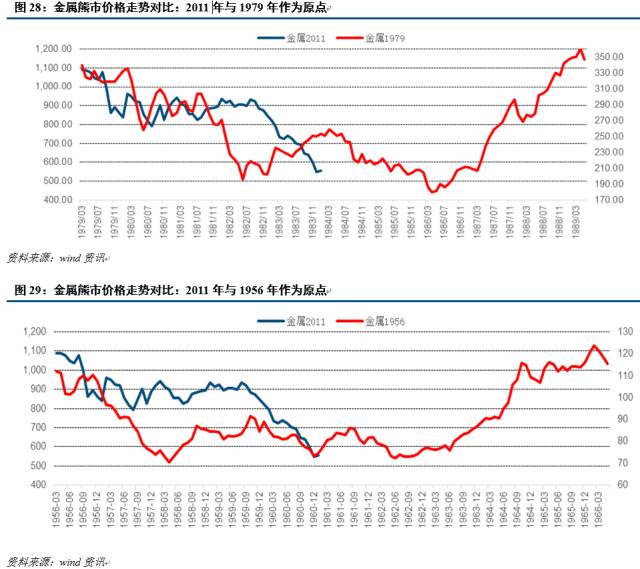 经过产能周期与超级周期的定位之后,我们可以对当前的2011年开始的大宗商品熊市进行一个性质的定位,显然,当前的商品熊市是超越了超级周期的,而更多的是一个产能周期级别的熊市。而从更短的超级周期来看,每轮超级周期的下跌一般都是在6到8年之间,所以,当前熊市的形态,基本可以类比1956年至1963年的熊市和1979年至1986年的熊市。而我们把1956年和1979年熊市进行了叠加,其走势具有惊人的相似性,所以,从技术走势上来看,这是完全可以参考的。因此,我们对2011年开始的本轮熊市与1956年熊市和1979年熊市分别进行叠加,得到如下图表。