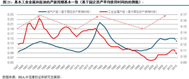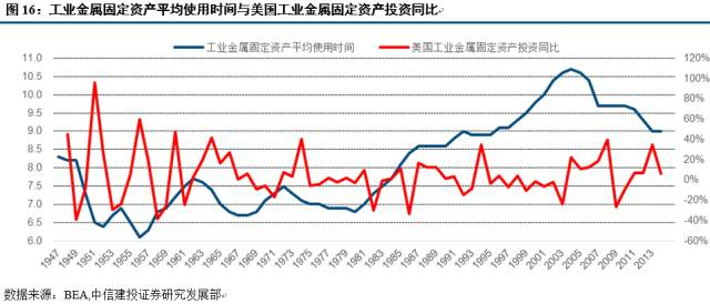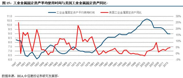 还有一种衡量商品产能周期的方法,就是用固定资产的平均使用年时间衡量商品的产能周期。这个指标指的是BEA通过间接法测量净固定资产数据,即Fix(t)=Fix(t-1)+GrossInvestment(t)-DepreciationorConsumptionoffixedcapital(t),固定资产平均使用时间是基于所有在产设备的加权平均使用时间,权重是每部分固定资产占总净固定资产的份额。固定资产平均使用时间的变化是由过去的投资和折旧的速率决定的,一项包含大量旧投资的固定资产的平均使用时间会较高。