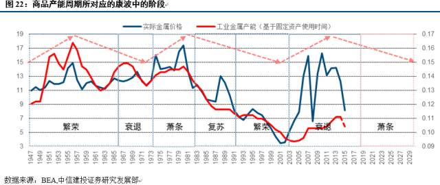 至于为什么商品的产能周期是25至30年,以我们对价格和产能关系的理解,我们认为在价格低点,一定是需求引致了价格的上升,然后引致了产能的上升,所以,我们推测这种需求来自于三个方面,一是主导国的经济繁荣如1947年是第四波康波繁荣的启动,资本主义黄金增长20年。二是追赶国的工业化,如2000年后中国工业化,1955后日本工业化;三是货币体系变化或者通胀因素。必须说明,这些解释都是无力的,当我们后面研究到大宗商品的价格波动周期时,可能有更加贴切的解释方法。