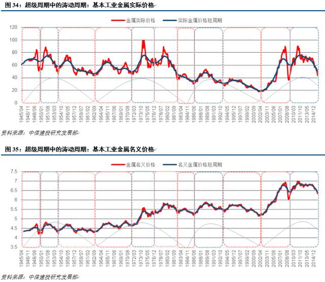 除了大宗商品的产能周期之外,大宗商品价格一定存在与中周期或者固定资投资趋势相关的更短周期,我们以国外论文的称呼,称之为超级周期。接下来,本文采用BP滤波对商品价格数据分两步进行处理。第一步,得到商品实际价格运行的长期趋势;第二步,剔除商品价格长期趋势,得到实际价格与长期趋势的偏离,并对其再次采用滤波处理,得到基本金属价格运行的超级周期(即SuperCycle),图中的两条线分别表示剔除长期趋势后的实际价格运行和超级周期。