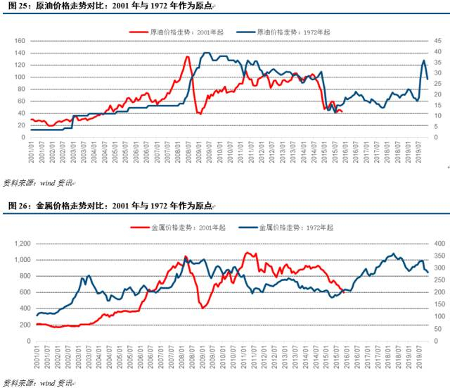 根据上面对产能周期的划分,我们进行了商品价格趋势的可比性叠加研究,我们选取了上一个产能周期的启动点1972年为价格起点。而本次产能周期则综合金属和原油的走势选取2001年为启动点,对价格趋势进行了叠加研究,得到如下图表。应该说,叠加取得了良好的效果,无论从原油还是金属来看,目前的价格都已经到达了一个重要的低点附近,这个低点在上一轮产能周期中是1986年,随后无论是金属还是原油都出现了价格反弹。而这种比较的意义,在后面的章节中会有更好的解释和更可信的结论。