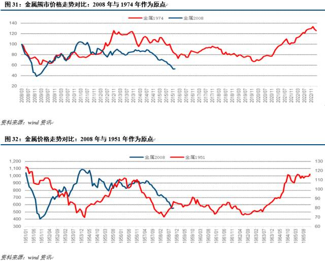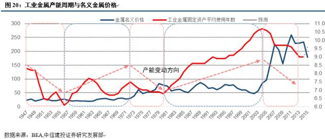 我们以金属价格与基本金属行业的固定资产平均使用时间进行了对比,发现了非常显著的反相关特征,也发现了明显的基本金属的产能周期。从数据可得的1947年之后,综合我们对大宗商品周期的理解,我们认为此种方法划分的固定资产平均使用时间产能周期可以划分为两个大的周期。以固定资产平均使用时间为基准,第一周期从1956年开始回升,经历1962年和1972年两个头部之后,在1972年达到高点,这一上升期历时16年,随后下降期至1980年结束,历时8年,总的周期自1956年到1980年,历时24年。