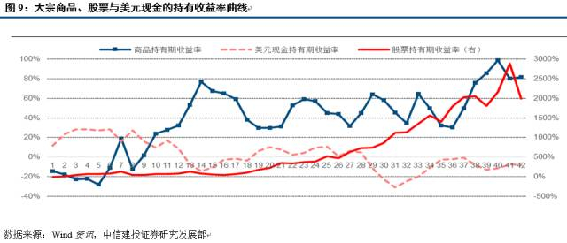 下图描述了投资标准普尔500股票、大宗商品和美元现金42年内的持有期收益率,横轴表示持有资产至今的年数。可以看出在长期,优质成分股的总体收益率远远超过大宗商品,且价格波动周期较短,而对于商品投资,其收益率呈显著的长周期波动特性。大宗商品资产收益的长周期性和“暴力性”赋予了其与传统金融资产不同的属性,这告诉我们,在大类资产配置中应该更为注重大宗商品的战略投资价值。