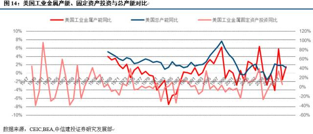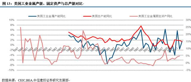 而显然,固定资产投资同比是一个中周期的指标,他更多的代表中周期的供需格局所导致的投资,而我们认为,商品的产能周期一定是超越中周期的范围的,后面的研究充分验证了这一点。而且我们确实找不到世界范围内的权威产能数据,美国的固定资产投资数据也只能代表美国的中周期需求,不代表世界的基本金属产能。