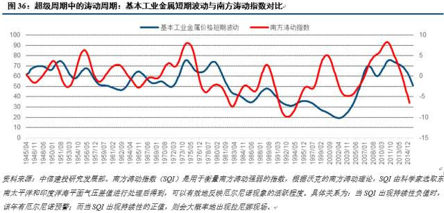在大宗商品的超级周期中,商品价格的波动规律又如何呢,我们以金属价格为例进行了分析,从超级周期来看,每一个超级周期中的金属价格表现大致可以分为三个波动,若观测实际价格,则中间的波动为最高点的概率偏大。若观测名义价格,依然是第二及第三波动的波动幅度偏大。如果这是必然规律,那么本轮超级周期自2001年开始,目前仅仅经历了两次波动,在2019年本轮超级周期结束之前,应该出现一次商品价格反弹。这一点也与我们前面研究的结论一致。我们将这种周期波动定义为大宗商品的涛动周期,我们理解他的波动形态类似于太阳黑子厄尔尼诺周期在海尔循环中的形态。