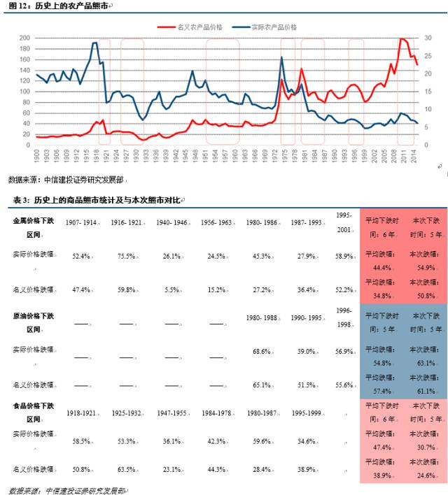 食品价格有其自身规律性,与金属及原油均不同步,从目前统计的六次熊市来看,平均下跌时间为6年,而本次熊市自2011年以来已经下跌5年。实际价格平均跌幅为47.4%,而本次熊市跌幅为30.7%。名义价格平均跌幅为38.9%,而本次熊市跌幅为24.6%。就农业熊市来看,本次跌幅低于平均水平。