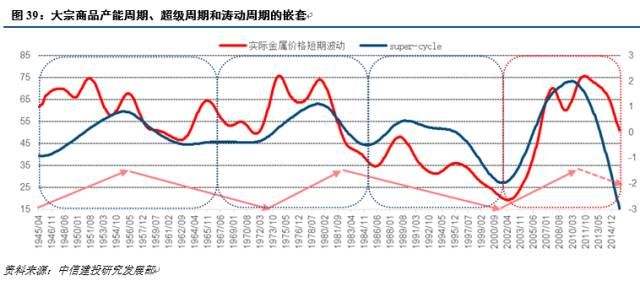 第三个层次,即商品的超级周期,他是滤去了商品的长期趋势后,得到的商品自身的波动周期,这个序列为18-20年。这个序列我们推测与实体经济中固定资产投资波动相关,更接近房地产周期。超级周期的形成可能与产能周期的波动阶段有关系。本次超级周期为2001年开始,2010年触顶,预测触底时间为2019年,历时18年。