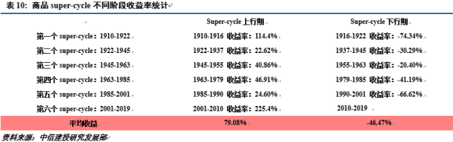 而从超级周期来看,超级周期上行期的平均价格涨幅为79%,而超级周期下行期的平均价格跌幅为46%,也表现出了大宗商品暴涨暴跌的特征。