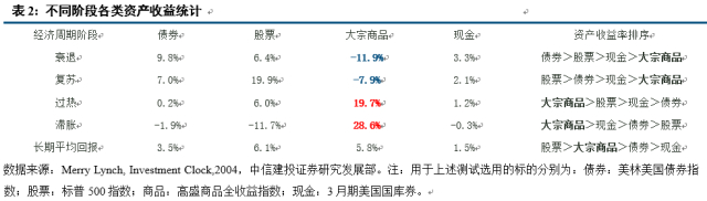 美林选用经合组织(OECD)“产出缺口”、消费者物价指数(CPI)以及美国超过30年(1973年4月至2004年7月)的资产回报率数据,对经济周期进行了划分,下表描述了经济周期的不同阶段各类资产收益率排序。从统计数据来看,虽然大宗商品的长期平均回报落后于股票,但其价格波动呈现鲜明的周期性和“暴力性”,其收益率在不同的时期呈现出两个极端,这说明在商品的下行周期中,商品收益率远低于其他资产,而在上行周期中,商品的表现又远远超过其他资产。