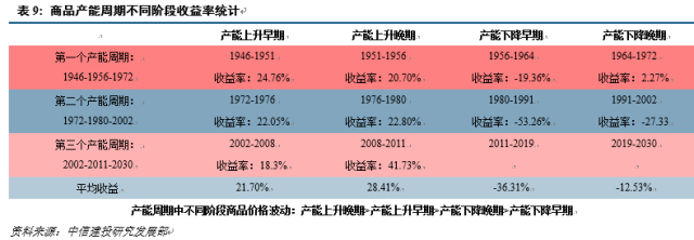 我们分别计算了大宗商品产能周期、超级周期的价格波动幅度,首先,将产能周期分为产能上升早期和晚期,产能下降早期和晚期,从价格波动测算来看,产能上升晚期的价格涨幅高于产能扩张早期,而产能下降早期的下跌幅度也明显大于产能下降晚期。也就是在产能周期的高点前后,波动最为剧烈,而在低点前后,波动相对和缓。