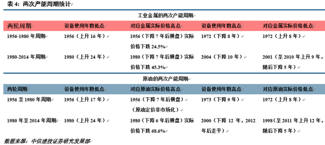 从上述数据来看,无论是时间还是下跌幅度,金属和石油都已经到达可以讨论熊市底部问题的阶段了。但统计研究的前提是如何进行周期划分,我们在第一部分中已经对大宗商品周期的康波规律进行了论述,但商品价格一次性的冲击毕竟是一个综合因素的结果。而如何界定每次大宗商品熊市的性质并在可对比的情况下进行研究,需要进行更加系统的大宗商品周期划分,而要解决的第一个问题,就是商品产能周期问题。
