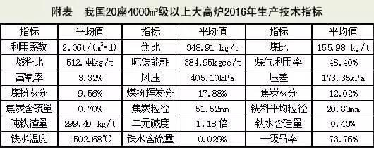 2016年,我国4000m3级以上高炉的平均燃料比为512.44kg/t,平均焦比为348.91kg/t,平均煤比为155.98kg/t;平均焦比较2011年~2014年平均值提高了5.29kg/t,而平均工序能耗却下降了8.51kgce/t,达到了384.95kgce/t,这反映出我国大型高炉在操作管理上更加注重适宜煤比和能耗的控制。附表是我国20座4000m3级以上大高炉2016年生产技术指标。
