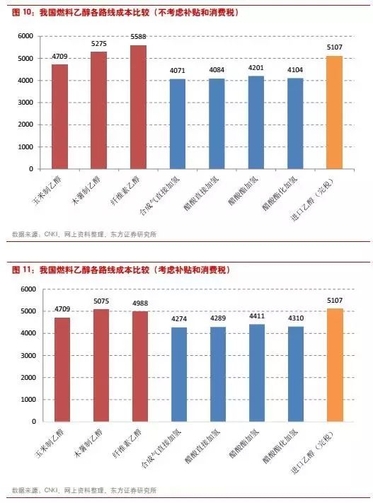 与生物质燃料乙醇相比,煤制乙醇的成本显著低于各代生物发酵乙醇,即使考虑生物质乙醇补贴和煤制乙醇 5%消费税以后(生物质乙醇免消费税),我国煤制乙醇仍然具有成本优势。