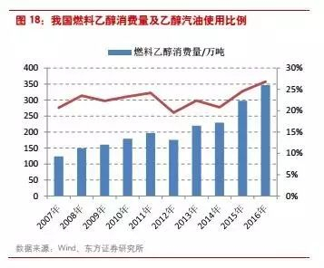 而从长期来看,我国 2016 年汽油表观消费量为 11983 万吨,如果按照 10%的添加比例测算燃料乙醇使用量将达到 1198 万吨,相比当前有近 940 万吨的需求缺口。