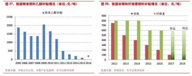 以木薯为原料的非粮乙醇也会在 2017 年被取消财政补贴,而纤维素乙醇的补贴虽未全部取消,但下滑至 600 元/吨,未来也处于观望状态。