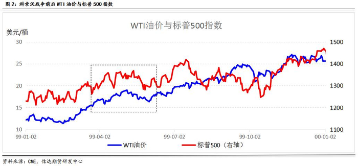 科索沃战争不同于以往的几次战争,它发生在欧洲而不是中东地区。中东产油国的产量并没有受到影响,世界原油的供需结构没有发生改变,因此战争期间油价的上涨幅度不是很大。WTI期货价格从战争初期的的15.34美金/桶涨至战争结束时期的17.66美金/桶,涨幅为15.12%;标准普尔指数也微幅上涨了2.8%。