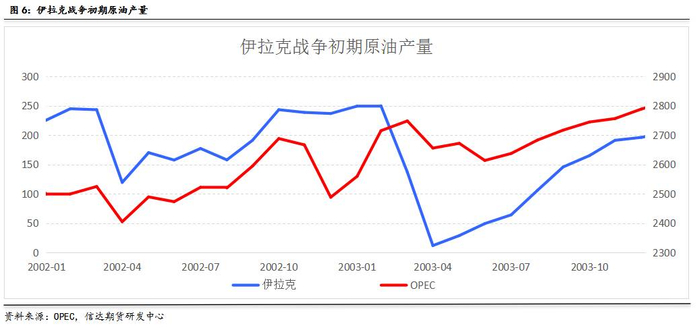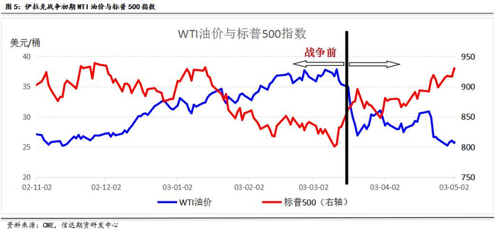 伊拉克是产油大国,2002年平均原油供应200万桶/日,占OPEC总供应量的8.3%,战争爆发将对伊拉克原油的生产活动造成影响。因此,在伊拉克战争爆发之前,市场不停地炒作战争预期,WTI原油期货从2002年11月中旬开始不断上涨,2003年2月27日涨至39.99美金/桶区间高位,涨幅达60%。