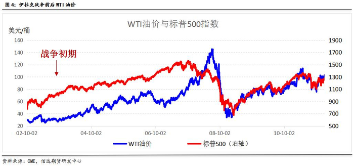 标普500指数在战争初期与原油走势背离,在战争开始后3个月内涨幅达到16.7%,这说明市场关注的焦点集中于战争所带来的供需端变量。之后标普500指数与原油上涨节奏基本保持一致,步入牛市周期。