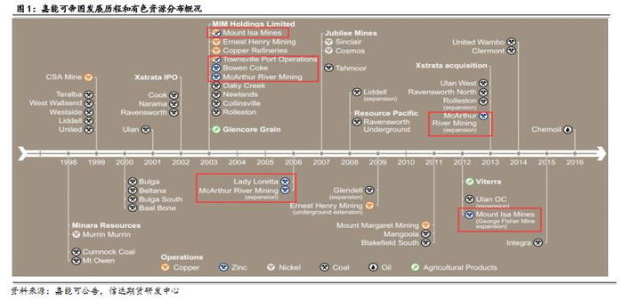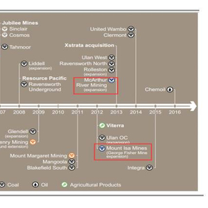 此外,嘉能可于2017年2月收购了Mutanda余下的31%权益(其拥有一级的铜、钴业务),7月又与兖煤澳洲公司协定以11.4亿美元收购Hunter Valley Operations(HVO)煤矿的49%股权,意在与兖煤澳洲公司成立一家合资企业来运营这座煤矿,以求大规模的采矿和经营协同效应。