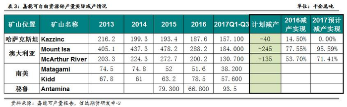 Lady Loretta矿2015年产量约15万吨,2016年已暂停生产。从实际的减产情况来看,Mount Isa矿减产执行相对严格,2016年预期完成减产目标的78%,2017年前三季度累计产量18.4万吨,若按照预期增速将完成减产的目标的96%,基本与预期相符。