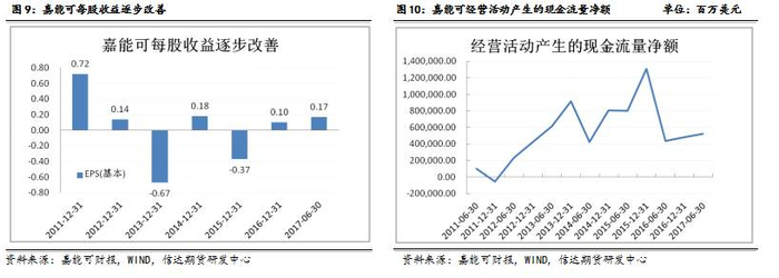 而且前期通过出售资产和库存来换取流动性属于断臂求生的行为,虽然能够马上改善存货周转天数,增强速度比率和流动比率,但未来存在很大的财务隐患。从图8可以看到,2016年底嘉能可长期债务和营运资产比率异常高,说明嘉能可一方面收缩资产换取流动性,另一方面又加强核心资产收购导致营运资金急剧下降。此外,今年嘉能可还面临着向股东派息的现金流压力。