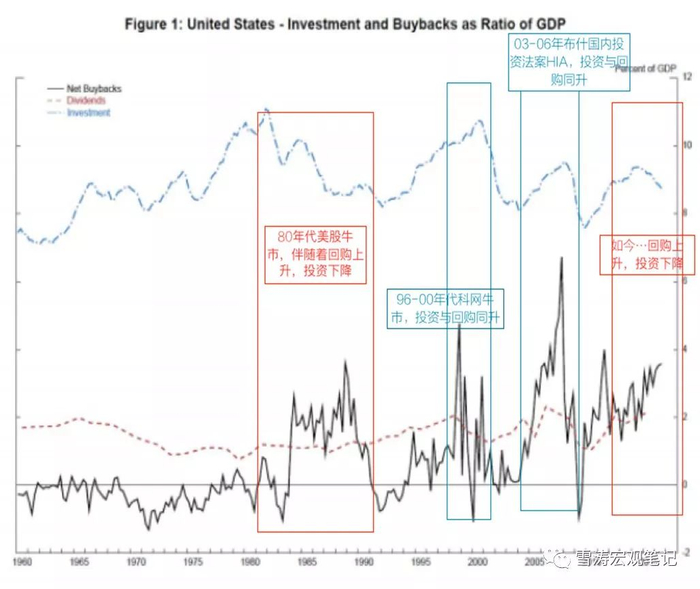 另一方面,由于70年代的滞涨和80年初高利率对经济的打击,劳动生产率还处在从低谷爬坡回到正常水平阶段。投资和消费的关系此消彼长,在投资边际收益高时,不管是公司还是居民,收入倾向于被再投资(反映到公司层面上是融资再投入CAPEX),相应地,消费支出(反映到公司层面上是回购、股利分红)被压抑。当技术逐渐过时,市场饱和,投资的边际效益降低,投资未来不如消费当下,公司层面成全了股票牛市。
