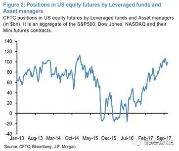 杠杆投资者占比上升。下图显示了CFTC统计的资管和杠杆基金的美股期货持仓量。去年以来股票期货的购买量稳步扩张。在过去两年中,这些头寸稳定而迅速地增长,每年平均增加约500亿美元。