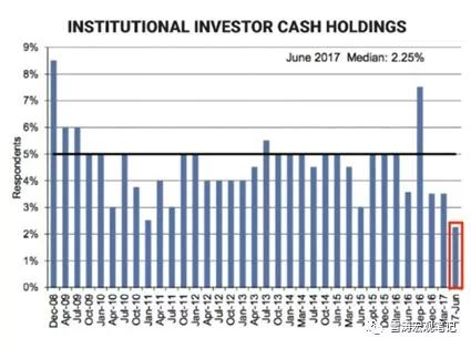 货币基金资产占基金行业比重仅20%,创近30年新低。而大量资金涌入股票共同基金,其现金持仓比例不到4%。去年6月对所有机构投资者的一项调查显示,整体持仓现金比例仅为2.25%。低现金仓位意味着未来能流入股票市场的资金几乎弹尽粮绝了。