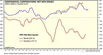 2009-2016年,美国非金融企业的股票回购(上图紫柱)和新增债券融资(下图蓝线)走势高度一致,也说明了企业回购股票的资金主要来自于低息债券融资。这段时间企业的负债结构也呈现出债权融资上升(下图蓝线)、股权融资下降(下图红线)的分化。