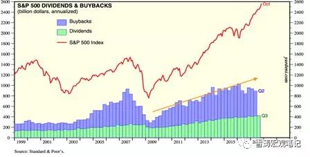 2009年至2016年,在低利率环境的刺激下,标普500上市企业的股票回购和分红持续上升。虽然回购在2016年下半年开始下降,但标普500指数只是在16年小幅回撤后继续大涨(下图红线)。