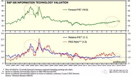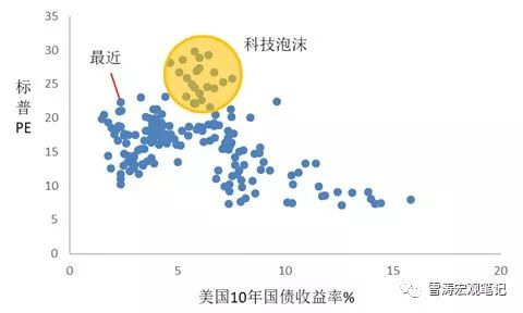 1999年科网泡沫时,标普500指数PE严重偏离标普指数与10年国债收益率的趋势线。虽然目前美股已经出现了估值泡沫化,但离当时的情况仍相差甚远。和1999年科网泡沫时的水平相比,目前标普500的相对估值也能勉强算正常。