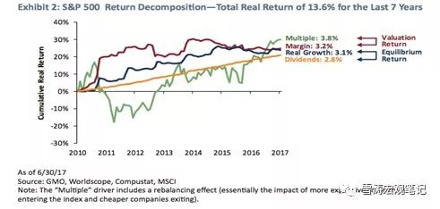 2010年至今,美股经历了连续8年没有发生过5%以上回撤的大牛市。根据GMO的研究结果,2010年至今美股的年化回报率为13.6%,其中超过一半(7%)是由估值因素(PE和杠杆)贡献。