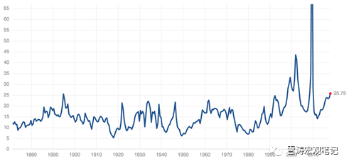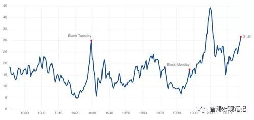 席勒周期性调整市盈率目前是31.51倍,已经超过了1929年大萧条,1987年黑色星期一,2008年金融危机。而历史中值只有16倍。目前的周期性调整市盈率仅次于1997-2000年的科网泡沫高峰期。