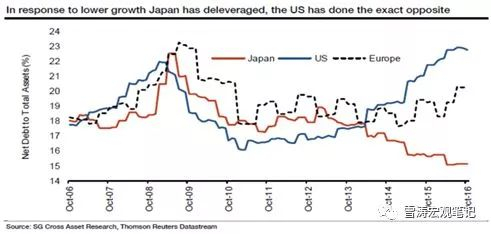 美联储的三轮QE虽然不像日本央行的QQE那样直接买股票ETF,但也间接地刺激了美国上市企业低息负债回购股票,进而推高EPS。2011年10月至今,美国非金融上市公司净资产负债率从16%上升到22%,2013年之后美国企业的资产负债率提升显著。