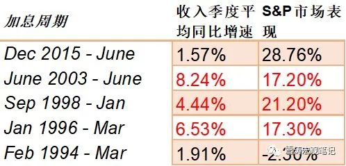 历史上,美联储的加息周期与美国经济的景气周期重合。在历史的加息周期中,美国企业的平均收入增速在4%以上。只有1994–1995年加息周期收入增速比较弱(不到2%),但当时市场的表现也很弱(-2.3%)。与历史形成鲜明对比的是,2015年底至今美国企业平均收入增速不到1.6%,然而股票市场的表现却是惊人的28%。