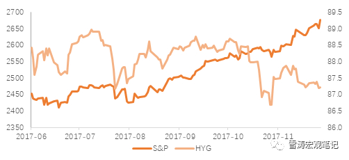 去年8月,美股和高收益债均发生回撤。标普在小幅回撤后继续一路上涨,而高收益债(HYG)见顶回落。10月下旬,高收益债崩盘,高收益债的利差拉开,美债期限曲线也进一步扁平化。
