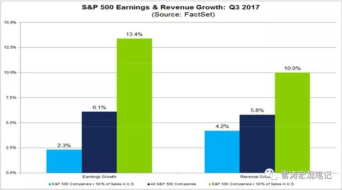优选海外收入占比较高公司,受益于美元走弱以及税改下海外美元回流的回购。从收入增长(10% vs 4.2%)和盈利增长(13.4% vs 2.3%)来看,海外收入占比较高的公司表现比国内业务主导的公司更好。