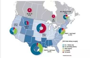 PADD I代表的东海岸有9个精炼厂,每天可加工原油130万桶。2015年,这些精炼厂加工原油110万桶,近2/3来自国外。不过,加拿大原油在这里没有优势,只拥有25.7万桶份额,其中一半来自加拿大西部,一半来自加拿大大西洋近海。