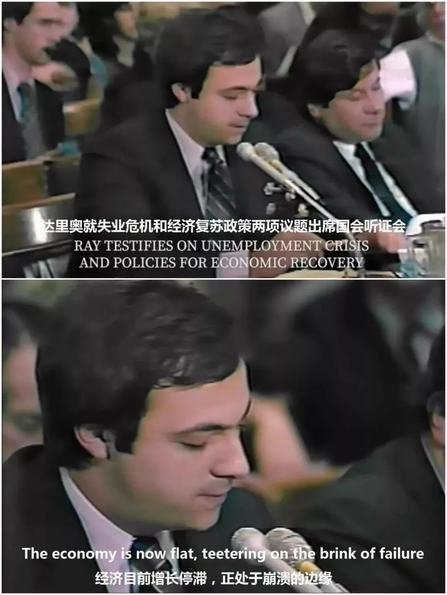 1979-1981年,美国陷入经济衰退,Dalio认为“我们债务的庞大规模意味着这场萧条将和1930年代一样严重,甚至更糟”。1982年,Dalio出席国会听证会,在电视观众面前留下了这段影像。事实证明,美国经济并没有崩溃,但“押注崩盘”的桥水却差点儿倒闭。