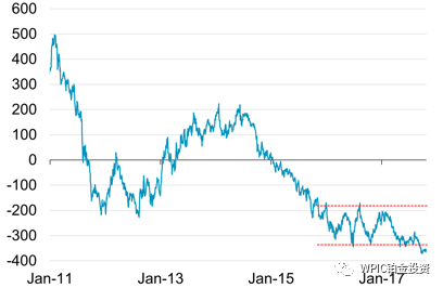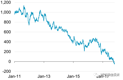 铂金溢价/(贴现)相对于钯价(美元/盎司)-对钯价溢价处于历史最低位