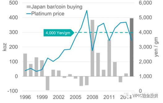 很多地区铂金条和铂金币的二级市场可能缺乏流动性。但是,市场机制一旦完善,铂金条和铂金币的需求就是强劲的,如下图所示日本投资需求对国内铂金价格下跌的反应。